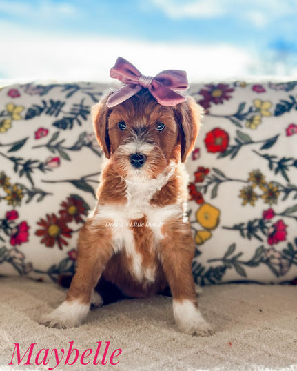 A red tuxedo mini.medium goldendoodle sitting down on a floral pillow that was happily adopted in No